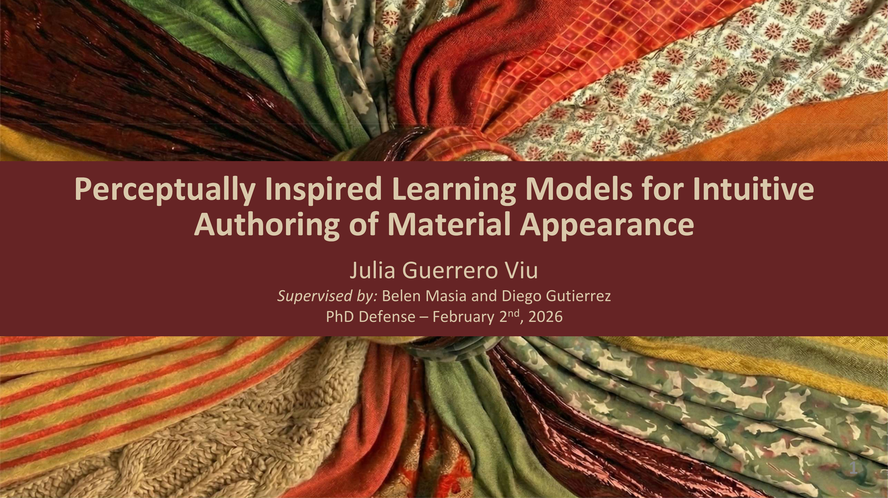 Julia Guerrero Viu defenderá su tesis doctoral titulada “Perceptually Inspired Learning Models for Intuitive Authoring of Material Appearance” el lunes 2 de febrero de 2026 a las 15:00 CET. La defensa se llevará a cabo en la Sala de Conferencias I3A (Planta 1) del edificio I+D+I.